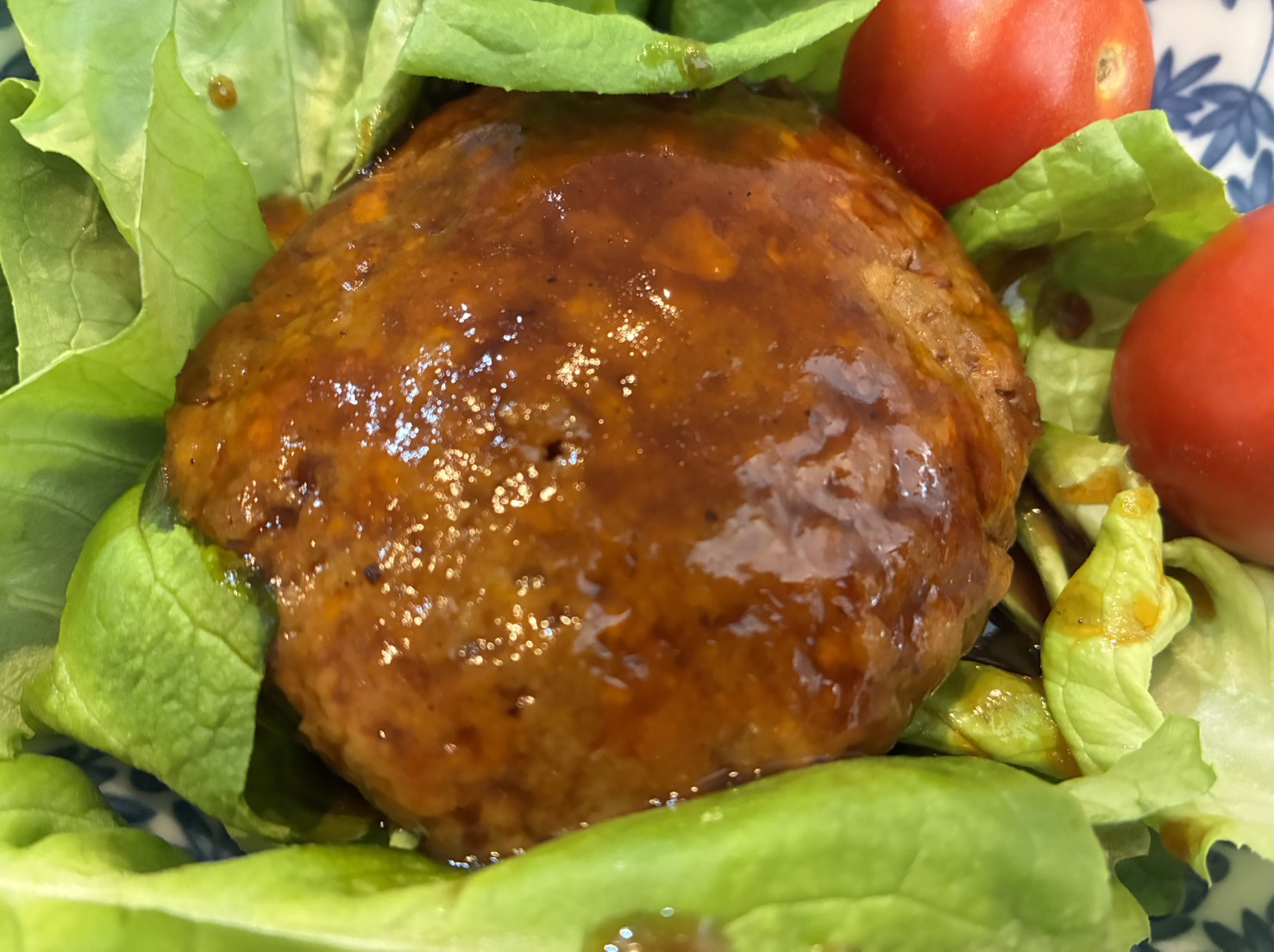 山盛りのレタスの上にハンバーグを載せてトマトを添えて頂きました。ごちそうさまでした!