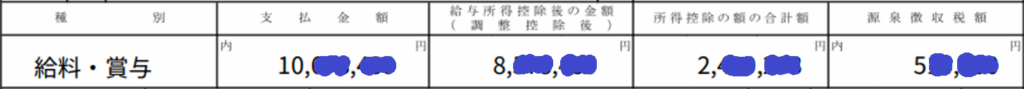 一部ぼかしを入れますが、源泉徴収票のスクショを公開しますので興味がある方はぜひ御覧ください!(※身バレを防ぐためぼかしているのはご容赦下さい。)